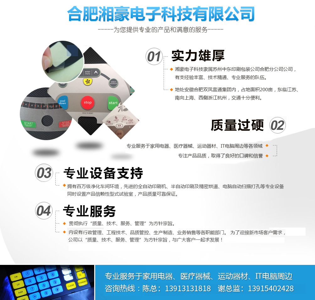 公司簡介   合肥湘豪電子科技有限公司系香港中意國際集團股份有限公司(1998年創(chuàng)建)下屬企業(yè),關(guān)系企業(yè)有:東莞中意塑膠制品有限公司(1996年創(chuàng)建),蘇州中意塑膠制品有限公司(2003年創(chuàng)建),蘇州中東包裝印刷有限公司(2007創(chuàng)建),蘇州捷瑞達自動化科技有限公司(2014年創(chuàng)建),東莞唯道實業(yè)有限公司(2014年創(chuàng)建),合肥六九機器人自動化科技有限公司(2015年創(chuàng)建);合作企業(yè)有:香港富通工業(yè)集團。   公司總部設在經(jīng)濟發(fā)達的香港,總公司這十幾年來先后在東莞,蘇州投資設廠,為滿足合肥市場廣大客戶的需求,總公司于2015年與香港富通工業(yè)集團合作在合肥投資設廠,打造電器控制面板,薄膜開關(guān)業(yè)界的航空母艦,創(chuàng)造專業(yè)產(chǎn)品,樹立精品觀念,鍛造高品質(zhì)、高服務的企業(yè)形象,樹立正確的核心價值觀。全心全意為國內(nèi)外品牌企業(yè)服...